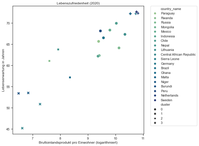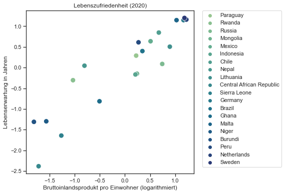- In der oberen rechten Ecke die Länder mit dem höchsten Bruttoinlandsprodukt pro Einwohner und einer sehr hohen Lebenserwartung.