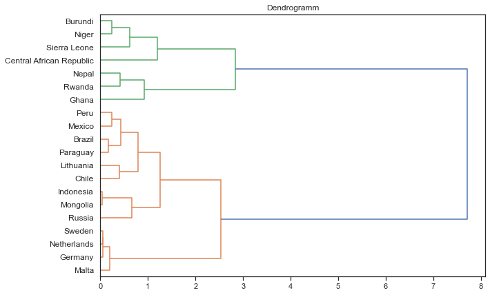 - Auf der linken Seite des Dendrogramms sind alle Länder aufgelistet.