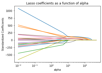 To better understand the role of alpha, we plot the lasso coefficients as a function of alpha (max_iter are the maximum number of iterations):